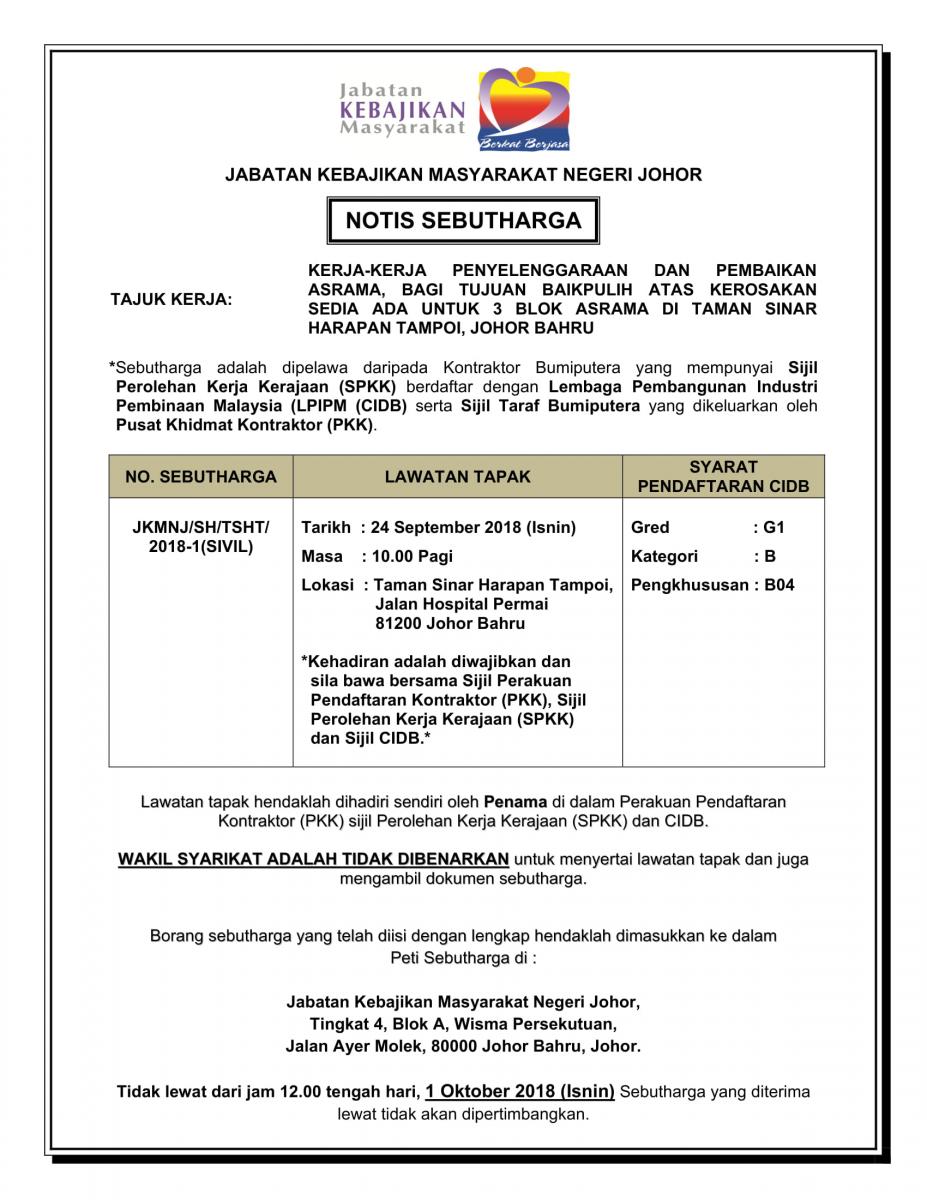 TAWARAN SEBUT HARGA BAGI KERJA-KERJA PENYELENGGARAAN & PEMBAIKAN, BAGI TUJUAN BAIKPULIH ATAS KEROSAKAN SEDIA ADA UNTUK 3 BLOK ASRAMA & SUSUR GAJAH DI TAMAN SINAR HARAPAN TAMPOI, JOHOR BAHRU