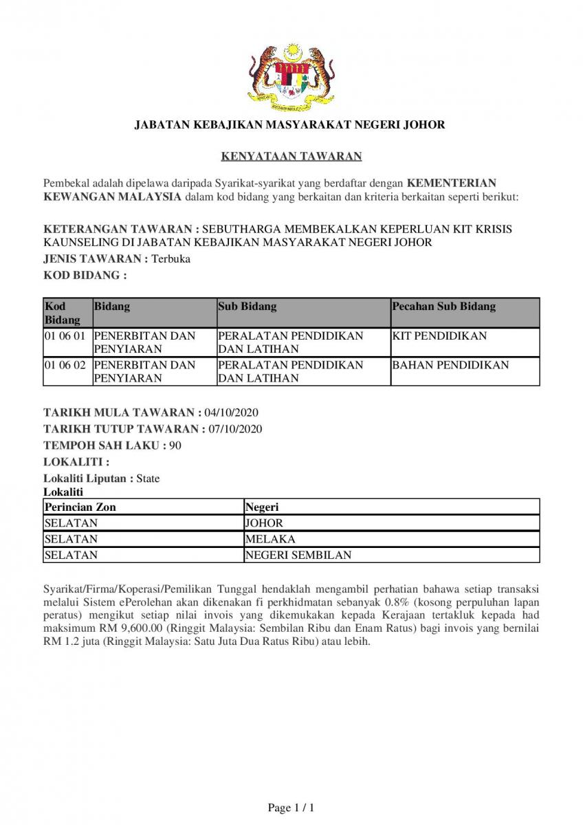 SEBUT HARGA MEMBEKAL KEPERLUAN KIT KRISIS KAUNSELING DI JABATAN KEBAJIKAN MASYARAKAT NEGERI JOHOR