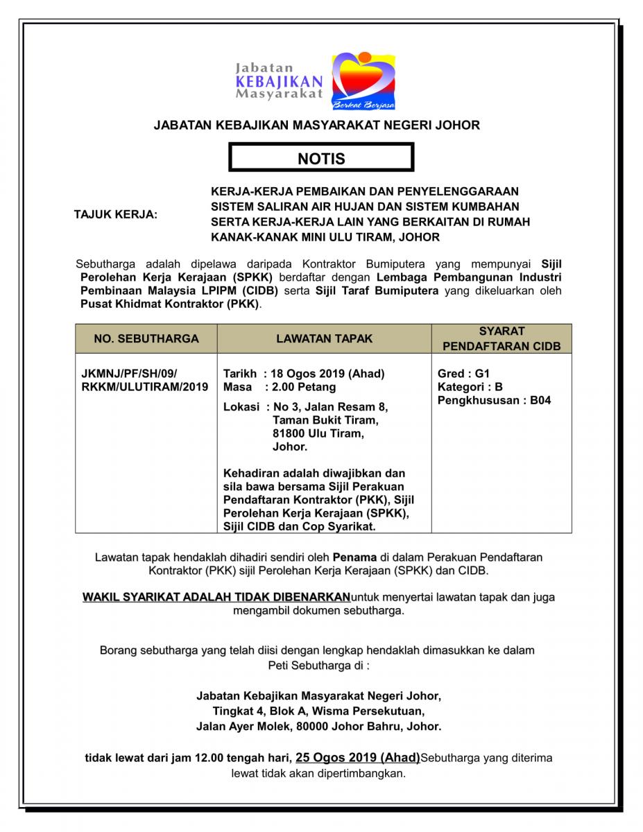 TAWARAN SEBUT HARGA BAGI KERJA-KERJA PENYELENGGARAAN & PEMBAIKAN SISTEM SALIRAN AIR HUJAN & SISTEM KUMBAHAN SERTA KERJA-KERJA LAIN YANG BERKAITAN DI RUMAH KANAK-KANAK MINI ULU TIRAM, JOHOR