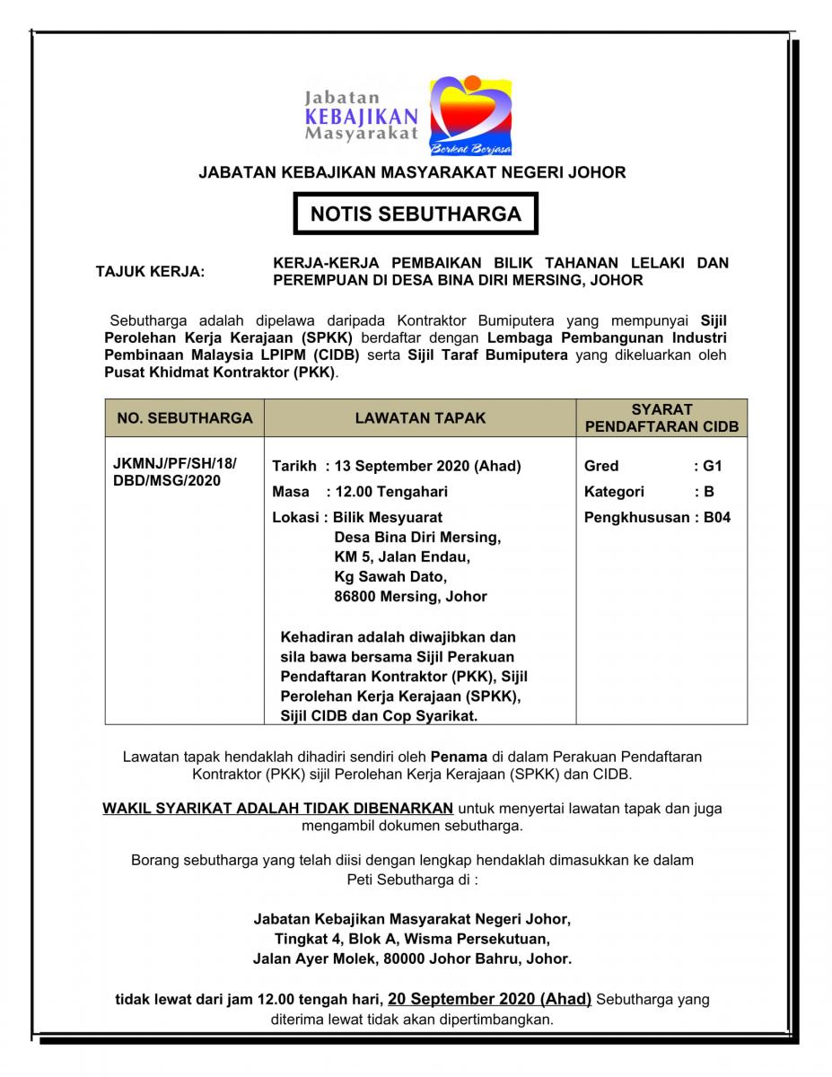 TAWARAN SEBUTHARGA KERJA -KERJA PEMBAIKAN BILIK TAHANAN LELAKI DAN PEREMPUAN DI DESA BINA DIRI MERSING