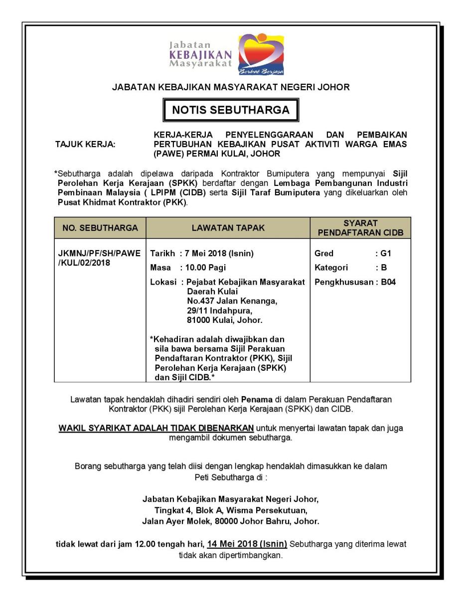 KERJA-KERJA PENYELENGGARAAN DAN PEMBAIKAN PERTUBUHAN KEBAJIKAN PUSAT AKTIVITI WARGA EMAS (PAWE) PERMAI KULAI, JOHOR