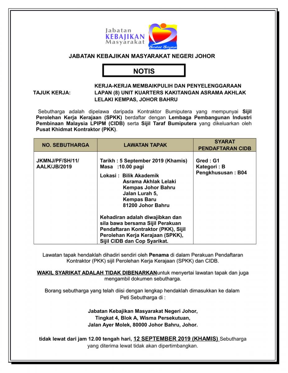 TAWARAN SEBUT HARGA BAGI KERJA-KERJA MEMBAIKPULIH & PENYELENGGARAAN LAPAN (8) UNIT KUATERS KAKITANGAN ASRAMA AKHLAK LELAKI KEMPAS, JOHOR BAHRU
