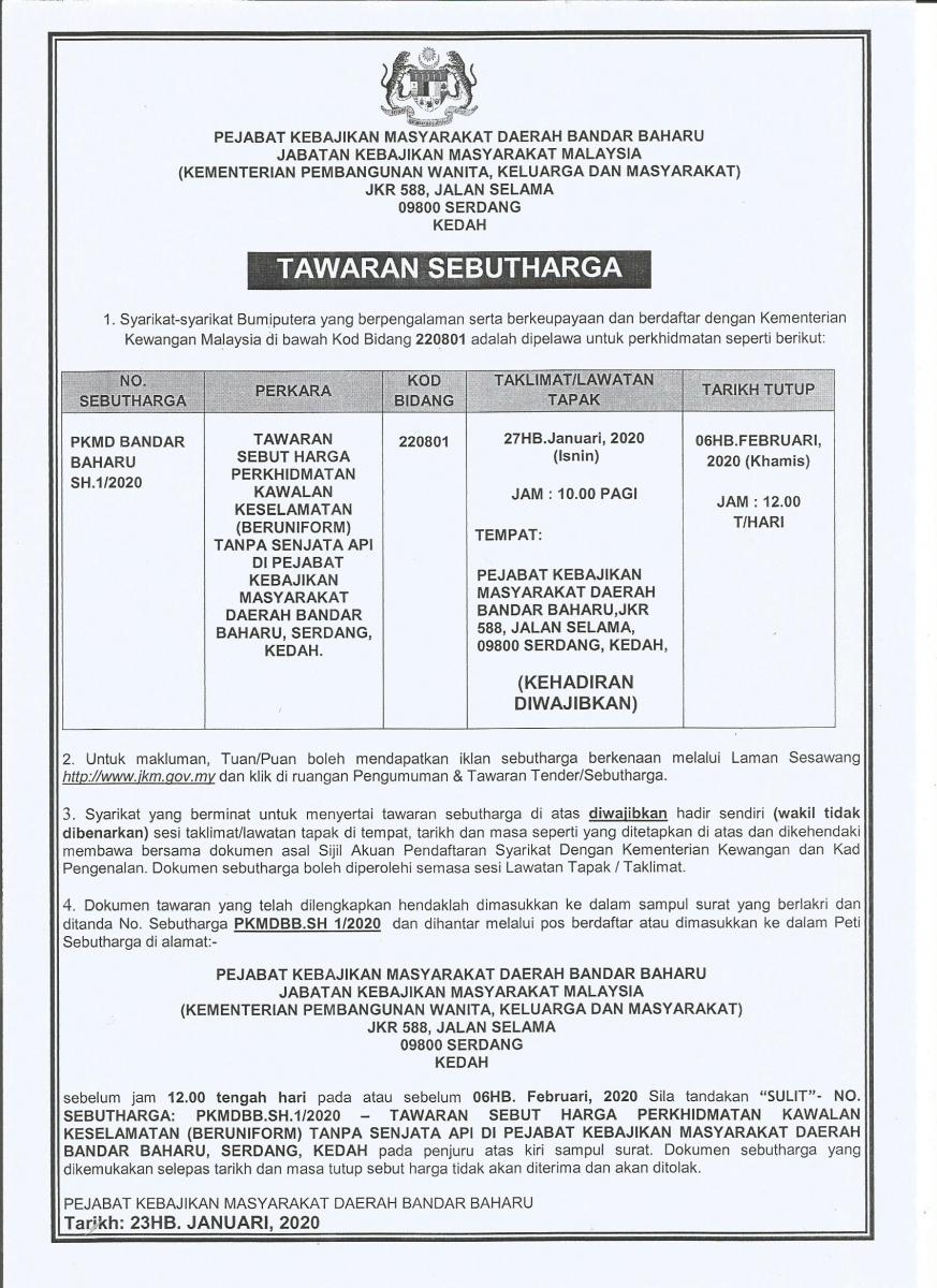 TAWARAN SEBUTHARGA PERKHIDMATAN KAWALAN KESELAMATAN (BERUNIFORM) TANPA SENJATA API DI PEJABAT KEBAJIKAN MASYARAKAT DAERAH BANDAR BAHARU SERDANG KEDAH