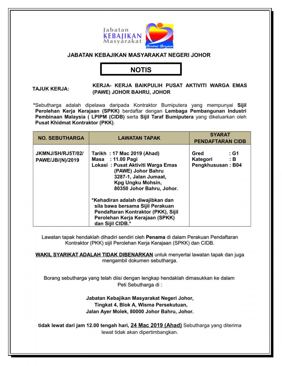 TAWARAN SEBUT HARGA BAGI KERJA-KERJA BAIKPULIH PUSAT AKTIVITI WARGA EMAS (PAWE) JOHOR BAHRU, JOHOR