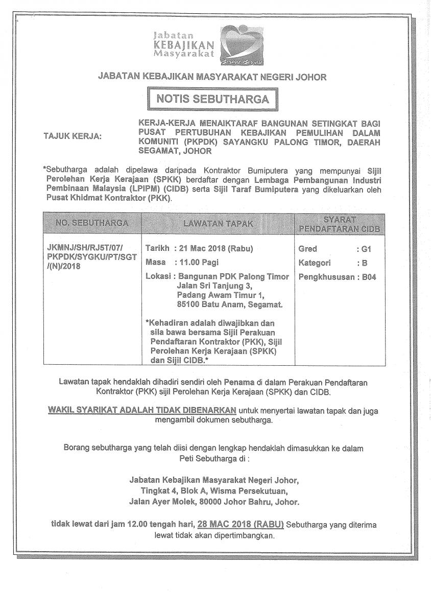 KERJA-KERJA MENAIKTARAF BANGUNAN SETINGKAT BAGI PUSAT PERTUBUHAN KEBAIJKAN PEMULIHAN DALAM KOMUNITI (PKPDK) SAYANGKU PALONG TIMOR SEGAMAT, JOHOR