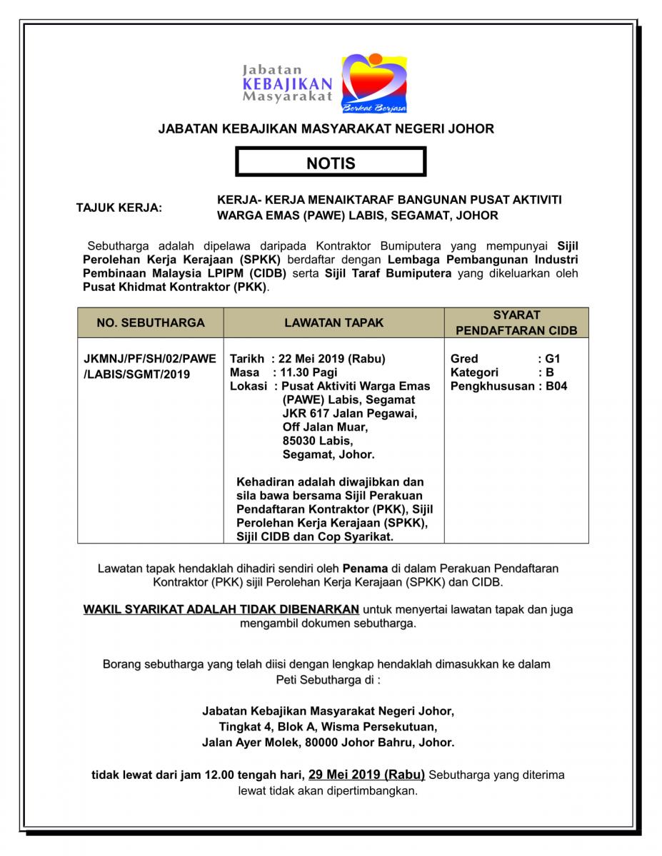 TAWARAN SEBUT HARGA BAGI KERJA-KERJA BAIKPULIH PUSAT AKTIVITI WARGA EMAS (PAWE) LABIS, SEGAMAT, JOHOR