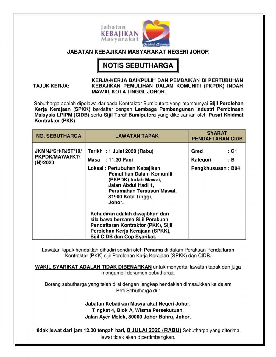TAWARAN SEBUT HARGA KERJA-KERJA BAIKPULIH DAN PEMBAIKAN DI PERTUBUHAN KEBAJIKAN PEMULIHAN DALAM KOMUNITI (PKPDK) INDAH MAWAI, KOTA TINGGI, JOHOR
